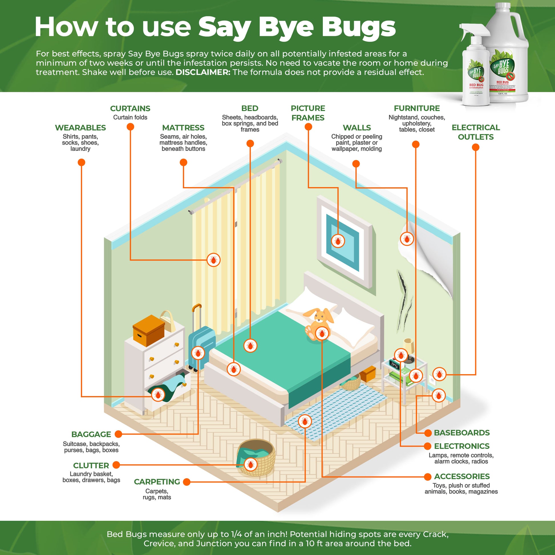 - To maximize the Bed Bug Infestation Treatment Efficiency, combine application of SayByeBugs Exterminator with: